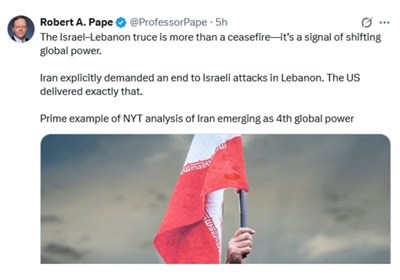 פרופסור מאוניברסיטת שיקגו אמר שהפסקת האש בלבנון מעידה על הופעתה של איראן כמעצמה עולמית — כלומר האיראנים משפיעים בזירה האזורית והגלובלית יותר מבעבר.